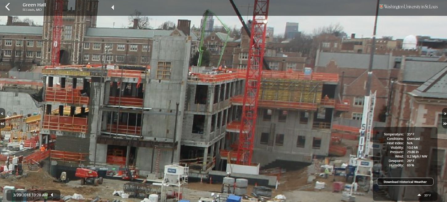 The following plan depicts the location of the cameras mounted on permanent structures along the periphery of the site. These permanent structures are the Brookings Hall, Green Hall and Hillman Hall respectively. The daily feed from these cameras are employed to track and monitor construction progress.